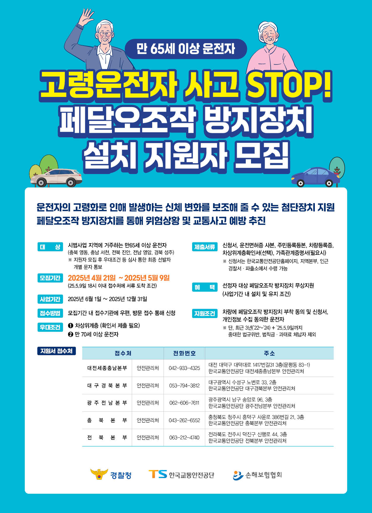 페달오조작 방지장치 무상 설치 지원사업은 지역별 지정된 본부를 통해 접수를 받고 있으며, 총 4개의 접수처가 운영 중입니다.